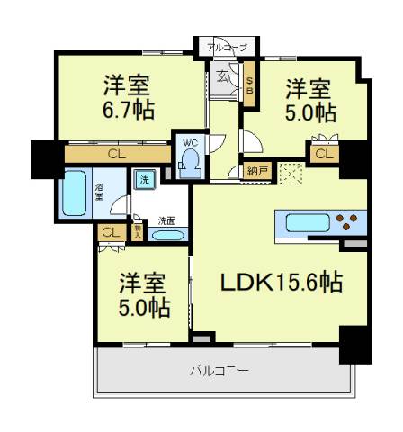 | 間取り詳細 | 洋室 6.7畳 、 洋室 5畳 、 洋室 5畳 、 LDK 15.6畳 |